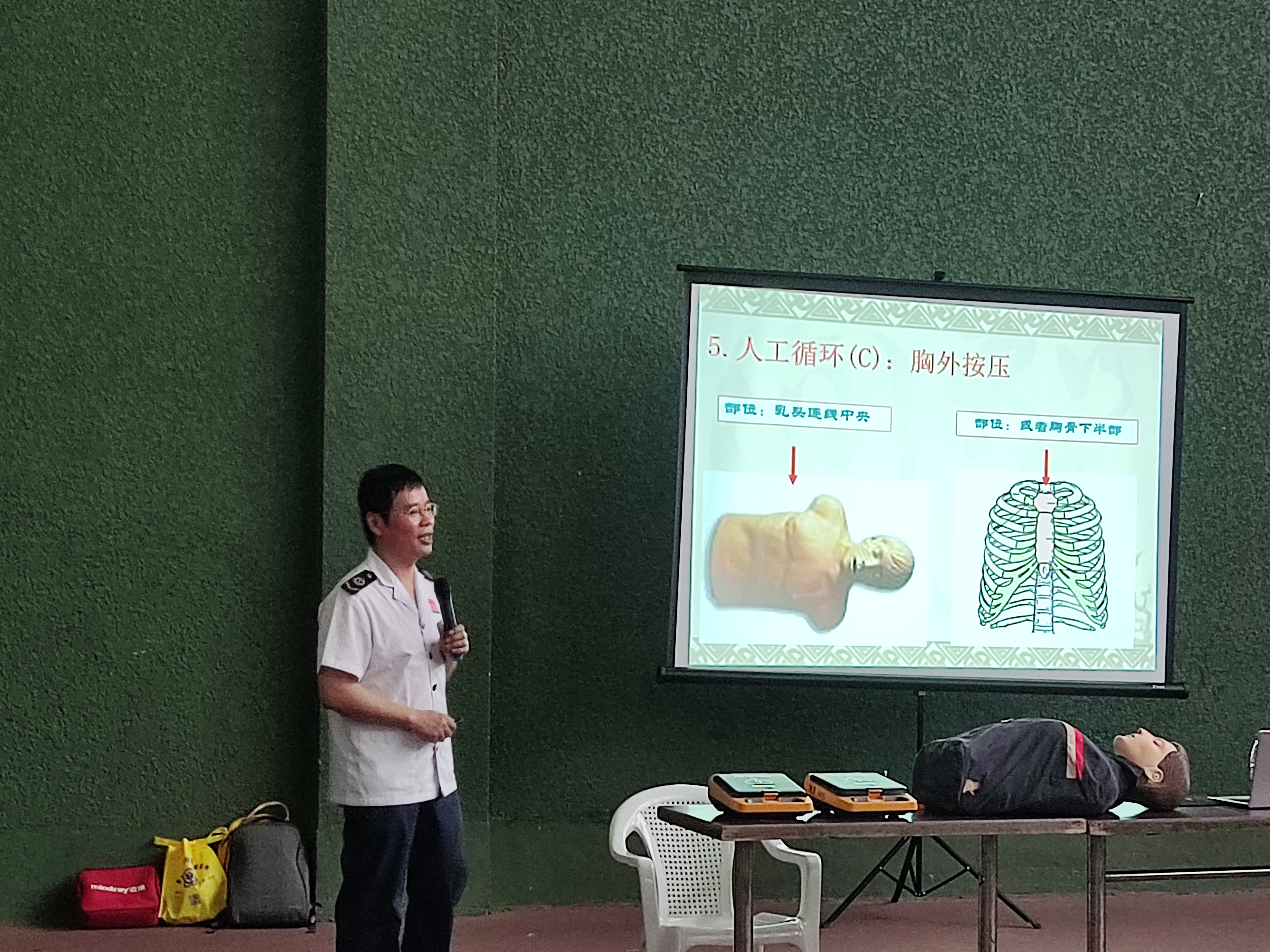 培训中,泉州市急救指挥中心相关人员通过图文、视频等方式,深入浅出地向大家讲解了心肺复苏CPR等基本概念,强调时间就是生命,以及黄金4分钟的重要性,演示了成人胸外心脏按压和口对口人工呼吸、自动体外除颤器(AED)的使用、气管异物阻塞海姆立克急救法以及外伤的几种包扎方法,将急救知识传授给在场的所有参训人员。