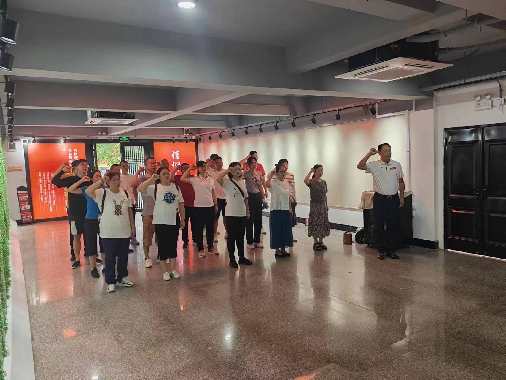 在纪念馆大厅,面对着鲜红的党旗,大家整齐划一地举起右拳,一起重温入党誓词,用铿锵有力的声音传递共产党员不变的初心和使命,向党和人民再次作出庄严的承诺。